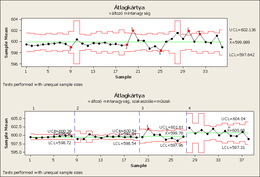 Átlagkártyák változó mintanagyság és szakaszolás esetén