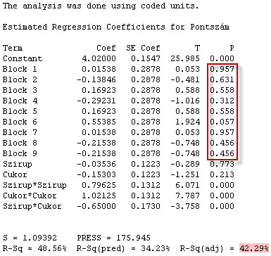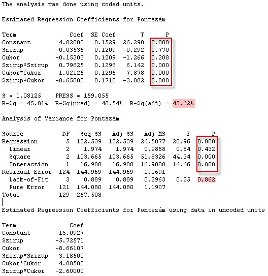 Pontszám = 15.09 - 5.73Szirup - 8.66Cukor + 3.18Szirup*Szirup + + 4.08Cukor*Cukor - 2.6Szirup*Cukor