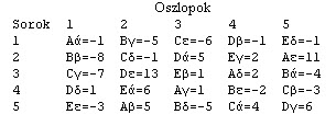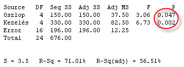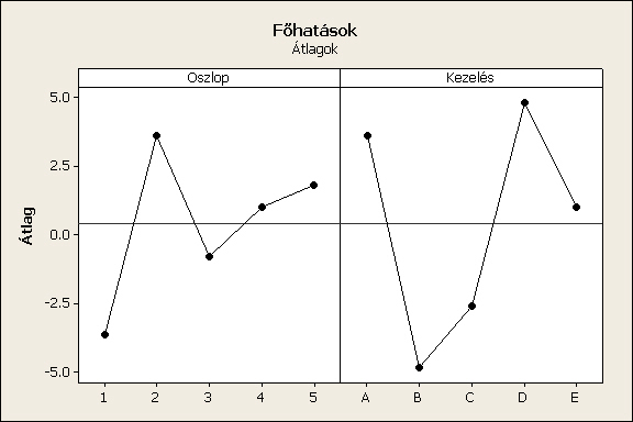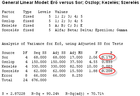 Válaszváltozó: számok = feszítőerő - 100 Faktorok: - sor: 5 anyag-tétel - oszlop: 5 operátor, akik összeállítják a robbanóanyagot - kezelés: 5 féle recept (A - E) - szerelés: 5 féle szerelési mód (ά - ε)