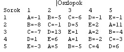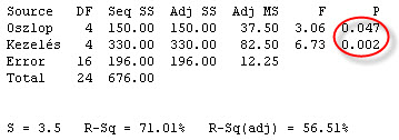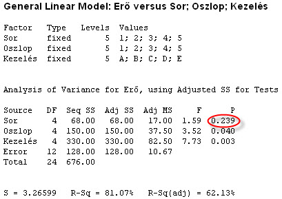 Válaszváltozó: számok = feszítőerő - 100 Faktorok: - sor: 5 anyag-tétel - oszlop: 5 operátor, akik összeállítják a robbanóanyagot - kezelés: 5 féle recept.
